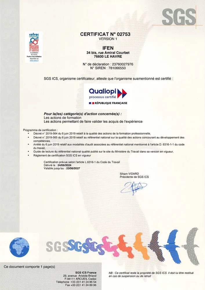 Depuis juin 2020, l’IFEN est certifié QUALIOPI, et notre engagement dans une démarche d’amélioration continue a été renforcé par l’audit de surveillance réalisé en juin 2024.